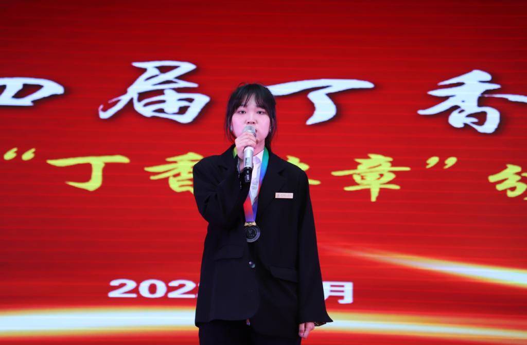 丁香奖章获得者、信息工程系视觉201班荆晓娜同学讲述了自己在第四学期期间参与疫情防控志愿服务的经历,表示将传承勤奋谦虚的丁香品质,不辜负学校和老师的期望。