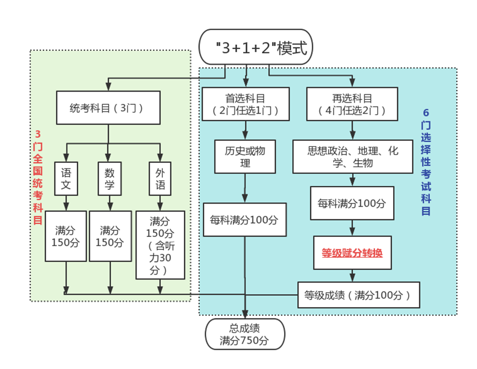 选择性考试科目,每门满分为100分。其中,首选科目(物理或历史)以原始成绩计入考生总成绩,再选科目(思想政治、地理、化学、生物学)根据等级赋分原则,将每科原始成绩转换为等级成绩,再计入考生总成绩。