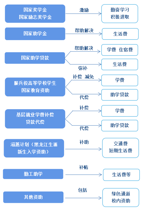 学校奖学金、困难补助、伙食补贴、 学费减免等 |